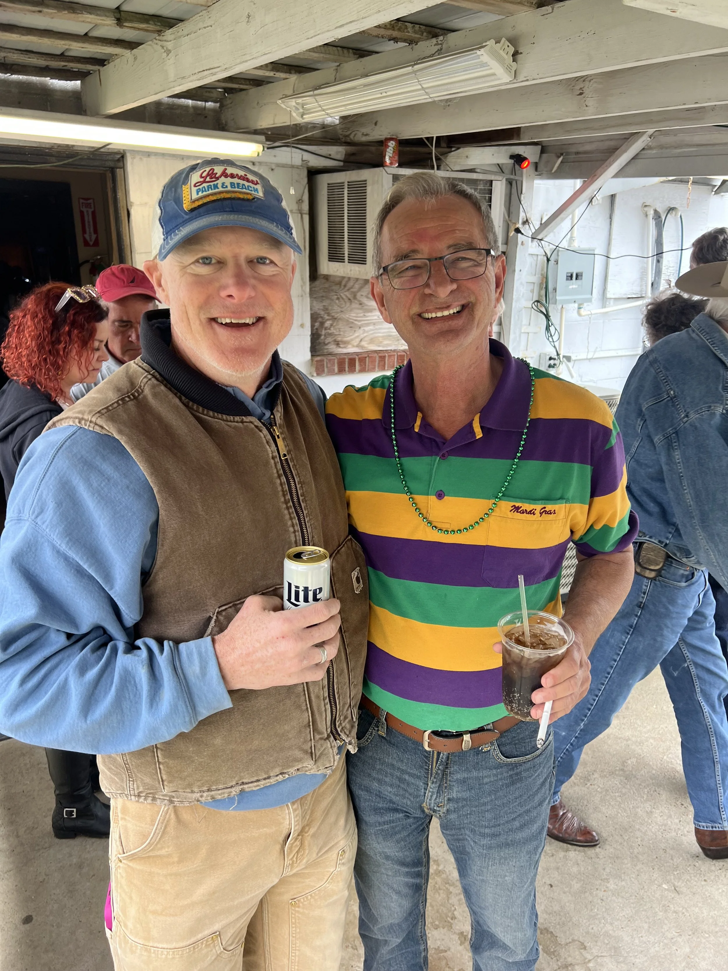 M. Kraska with Cajun legend, Donny Broussard behind Fred’s Lounge between sets, Lundi Gras, 2025